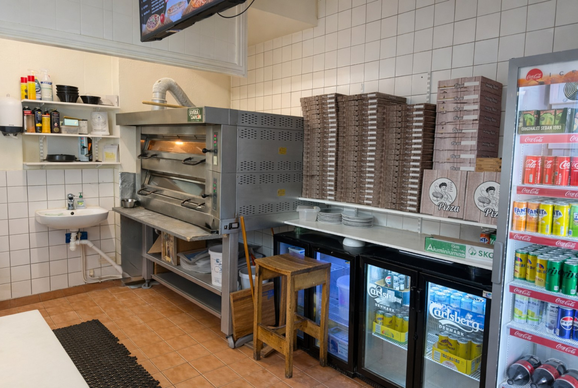 Lokalen har en yta om cirka 138 kvm samt källarutrymme som används för lager och förvaring. Planlösningen är mycket funktionell med bra arbetsytor och två entréer från gatan – en mot pizzadelen och en mot restaurangdelen, även om verksamheten bedrivs i samma lokal.